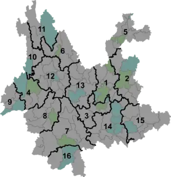Le Yunnan est découpé en 16 villes-préfectures : huit villes-préfectures et huit préfectures autonomes :