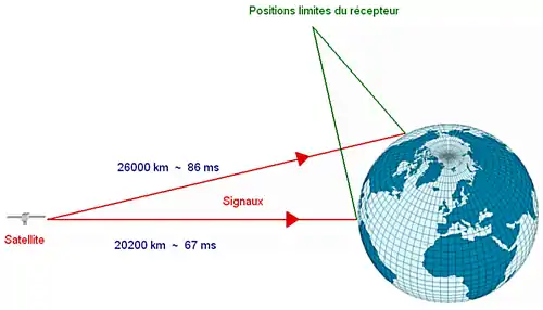 Pour avoir une idée de l’ordre de grandeur du retard mesuré, il faut prendre en considération la distance du satellite au récepteur. Le satellite étant distant de la terre de 20 200 kilomètres, la distance réelle varie de 20 200 à 26 000 kilomètres, le retard est donc compris entre 67 et 86 millisecondes.