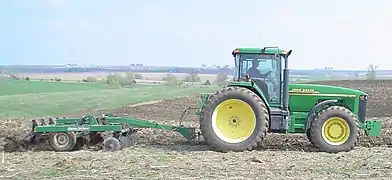 Pseudo-labour profond (ou décompactage) avec une charrue-chisel et un tracteur de 200 chevaux, États-Unis, 2004. - Les outils peuvent être combinés; exemple : dents de cultivateur + train de disques (photo).