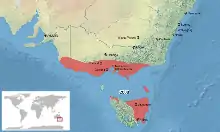 Cette espèce est endémique du Sud-Est de l'Australie[1]. Elle se rencontre dans l’extrême Sud-Est de l'Australie-Méridionale, dans le sud du Victoria et en Tasmanie. Son aire de répartition couvre environ 99 400 km2[2].