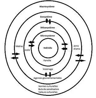 - Le macrosystème : Cette sphère est la couche la plus englobante du système écologique. Elle représente les normes culturelles, les buts de socialisation et les valeurs propres à une culture donnée[3].