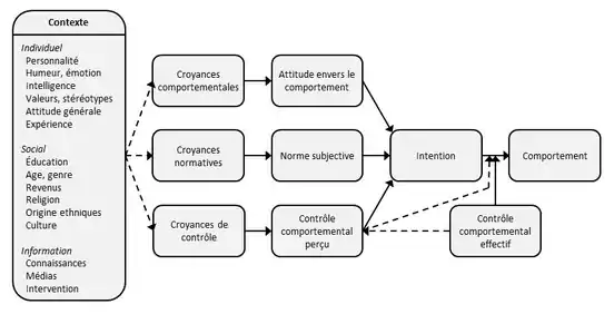 Dès les origines de la discipline, il était considéré comme évident que les comportements individuels étaient guidés par les attitudes[36]. Pourtant un nombre grandissant d'études ont montré une inconsistance entre les attitudes et les comportements, à tel point qu'à la fin des années 1960 il a été proposé par certains chercheurs d'abandonner l'idée que les attitudes étaient de bons antécédents des comportements[37]. De nombreux travaux ont par la suite cherché à comprendre pourquoi l'attitude n'était pas toujours un bon « prédicteur » du comportement. Les chercheurs ont notamment introduit le concept d'intention comme intermédiaire entre l'attitude et le comportement (voir aussi implémentation d'intention[38]). De plus, ils ont identifié des facteurs modérateurs susceptibles d'altérer le lien attitude-comportement. Le premier de ces facteurs est la norme subjective, c'est-à-dire le comportement et les attentes d'autrui, qui exerce une pression sociale pouvant être contraire à l'attitude d'un individu (voir théorie de l'action raisonnée). Le second facteur, identifié quelques années plus tard, est le contrôle comportemental perçu, ou l'auto-efficacité perçue, qui peut amener les individus à renoncer à certains comportements qu'ils estiment ne pas pouvoir contrôler suffisamment. Avec l'ajout de ce second facteur dans le modèle, la théorie de l'action raisonnée devient la théorie du comportement planifié.