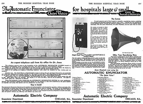 En , l'Automatic Electric Company (en) de Chicago, dans l'Illinois, qui était déjà un important fournisseur de standards téléphoniques automatiques, annonça qu'elle avait mis au point un haut-parleur, qu'elle commercialisa sous le nom d’Automatic Enunciator (ou annonceur automatique). Le président de la société, Joseph Harris, prévoyait de multiples utilisations potentielles, et la publicité initiale soulignait la valeur de l'invention en tant que système de sonorisation d'hôtel, permettant aux personnes dans toutes les pièces publiques d'entendre les annonces vocales[2]. En juin 1910, une première démonstration "semi-publique" est faite aux journalistes de la presse dans le bâtiment de l'Automatic Electric Company, où la voix d'un orateur est transmise à des haut-parleurs placés à une douzaine d'endroits « dans tout le bâtiment »[3].