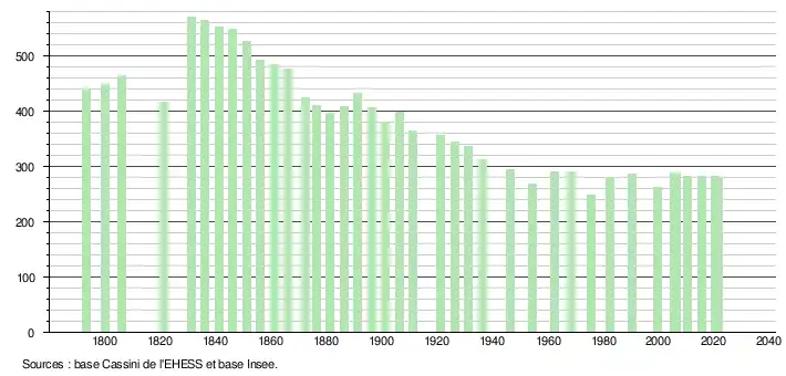 L'évolution du nombre d'habitants est connue à travers les recensements de la population effectués dans la commune depuis 1793. Pour les communes de moins de 10 000 habitants, une enquête de recensement portant sur toute la population est réalisée tous les cinq ans, les populations légales des années intermédiaires étant quant à elles estimées par interpolation ou extrapolation[18]. Pour la commune, le premier recensement exhaustif entrant dans le cadre du nouveau dispositif a été réalisé en 2005[19].