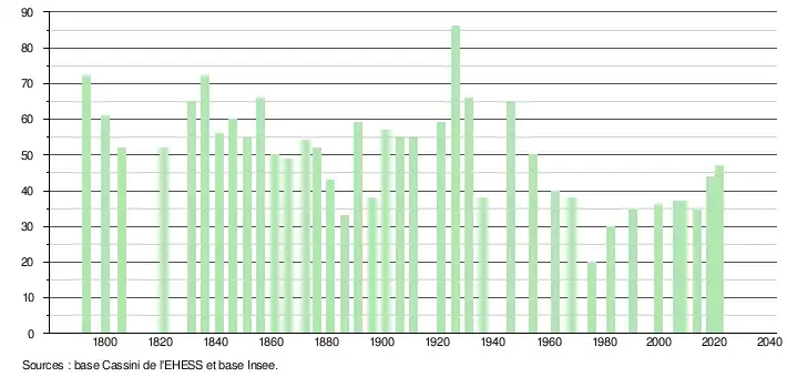 L'évolution du nombre d'habitants est connue à travers les recensements de la population effectués dans la commune depuis 1793. Pour les communes de moins de 10 000 habitants, une enquête de recensement portant sur toute la population est réalisée tous les cinq ans, les populations légales des années intermédiaires étant quant à elles estimées par interpolation ou extrapolation[22]. Pour la commune, le premier recensement exhaustif entrant dans le cadre du nouveau dispositif a été réalisé en 2008[23].