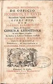 - Samuel von Pufendorf : Du Droit de la nature et des gens, ou Système général des principes les plus importants de la morale, de la jurisprudence et de la politique (2 volumes, 1706) Texte en ligne 1 2
