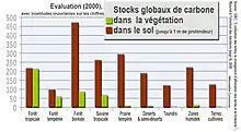 Cette quantité de carbone serait stockée pour moitié dans les sols (litière plus humus) et plus provisoirement peut-être pour moitié dans les arbres (feuilles, branches, racines y compris)[13]. Seule une petite partie de ce carbone peut être considérée comme durablement stockée.