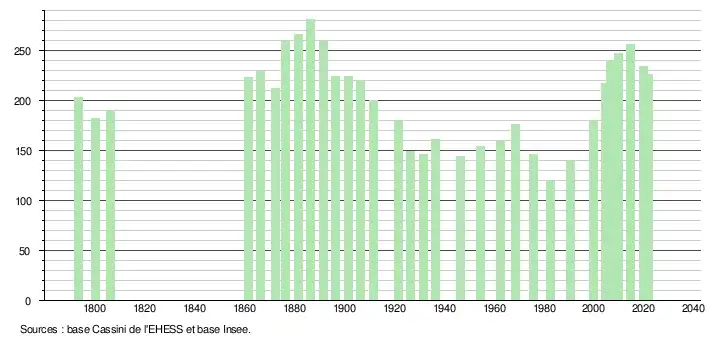 L'évolution du nombre d'habitants est connue à travers les recensements de la population effectués dans la commune depuis 1793. Pour les communes de moins de 10 000 habitants, une enquête de recensement portant sur toute la population est réalisée tous les cinq ans, les populations légales des années intermédiaires étant quant à elles estimées par interpolation ou extrapolation[15]. Pour la commune, le premier recensement exhaustif entrant dans le cadre du nouveau dispositif a été réalisé en 2004[16].