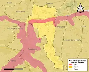 Le retrait-gonflement des sols argileux est susceptible d'engendrer des dommages importants aux bâtiments en cas d’alternance de périodes de sécheresse et de pluie. La totalité de la commune est en aléa moyen ou fort (67,4 % au niveau départemental et 48,5 % au niveau national). Sur les 183 bâtiments dénombrés sur la commune en 2019, 183 sont en aléa moyen ou fort, soit 100 %, à comparer aux 84 % au niveau départemental et 54 % au niveau national. Une cartographie de l'exposition du territoire national au retrait gonflement des sols argileux est disponible sur le site du BRGM[18],[Carte 2].