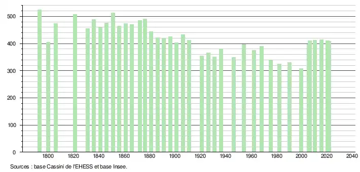 | L'évolution du nombre d'habitants est connue à travers les recensements de la population effectués dans la commune depuis 1793. Pour les communes de moins de 10 000 habitants, une enquête de recensement portant sur toute la population est réalisée tous les cinq ans, les populations légales des années intermédiaires étant quant à elles estimées par interpolation ou extrapolation[24]. Pour la commune, le premier recensement exhaustif entrant dans le cadre du nouveau dispositif a été réalisé en 2005[25]. En 2021, la commune comptait 409 habitants[Note 3], en diminution de 1,45 % par rapport à 2015 (Gironde : +6,88 %, France hors Mayotte : +1,84 %). |