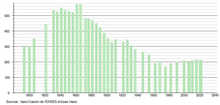 | L'évolution du nombre d'habitants est connue à travers les recensements de la population effectués dans la commune depuis 1793. Pour les communes de moins de 10 000 habitants, une enquête de recensement portant sur toute la population est réalisée tous les cinq ans, les populations légales des années intermédiaires étant quant à elles estimées par interpolation ou extrapolation[26]. Pour la commune, le premier recensement exhaustif entrant dans le cadre du nouveau dispositif a été réalisé en 2005[27]. En 2021, la commune comptait 212 habitants[Note 7], en diminution de 0,93 % par rapport à 2015 (Tarn : +1,82 %, France hors Mayotte : +1,84 %). |
