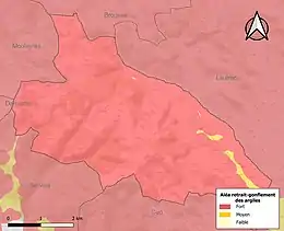 La commune est vulnérable au risque de mouvements de terrains constitué principalement du retrait-gonflement des sols argileux[21]. Cet aléa est susceptible d'engendrer des dommages importants aux bâtiments en cas d’alternance de périodes de sécheresse et de pluie. La totalité de la commune est en aléa moyen ou fort (76,3 % au niveau départemental et 48,5 % au niveau national). Sur les 106 bâtiments dénombrés sur la commune en 2019, 106 sont en aléa moyen ou fort, soit 100 %, à comparer aux 90 % au niveau départemental et 54 % au niveau national. Une cartographie de l'exposition du territoire national au retrait gonflement des sols argileux est disponible sur le site du BRGM[22],[Carte 3].