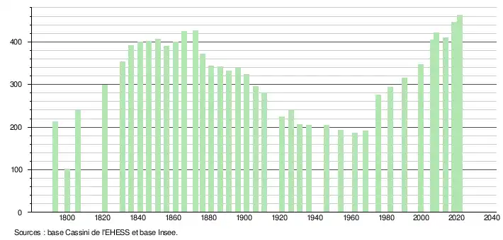 L'évolution du nombre d'habitants est connue à travers les recensements de la population effectués dans la commune depuis 1793. Pour les communes de moins de 10 000 habitants, une enquête de recensement portant sur toute la population est réalisée tous les cinq ans, les populations légales des années intermédiaires étant quant à elles estimées par interpolation ou extrapolation[18]. Pour la commune, le premier recensement exhaustif entrant dans le cadre du nouveau dispositif a été réalisé en 2008[19].