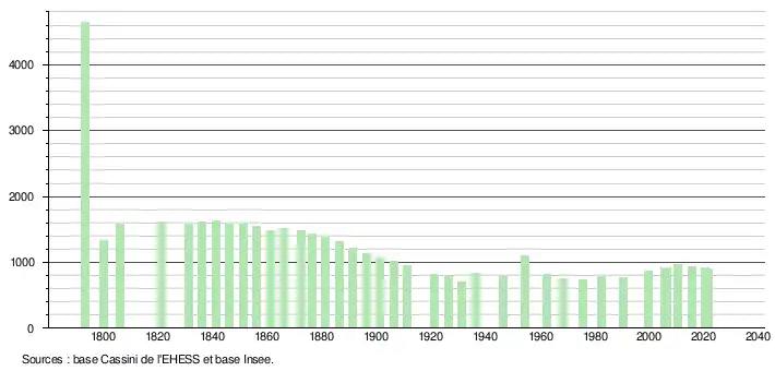 L'évolution du nombre d'habitants est connue à travers les recensements de la population effectués dans la commune depuis 1793. Pour les communes de moins de 10 000 habitants, une enquête de recensement portant sur toute la population est réalisée tous les cinq ans, les populations légales des années intermédiaires étant quant à elles estimées par interpolation ou extrapolation[25]. Pour la commune, le premier recensement exhaustif entrant dans le cadre du nouveau dispositif a été réalisé en 2005[26].