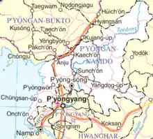 Le Pyongan du Sud est situé au centre du pays et a une frontière commune avec presque toutes les provinces de la Corée du Nord. Il entoure la ville de Pyongyang sur trois côtés. Sur le côté sud, il est également limitrophe du Hwanghae du Nord. À l'est, il touche au Kangwon et au Hamgyong du Sud. Au nord, c'est le Jagang et le Phyongan du Nord. Sa côte occidentale s'étend le long de la mer Jaune. Des polders ont été construits, celui de Kumsong couvre 33 km2[1]. À Nampho, l'estuaire du Taedong (439 km) est barré par un barrage de 15 km construit entre 1981 et 1986. La province recouvre la plus grande partie du bassin du Taedong.