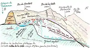 - d'une part, le pic de surrection des Pyrénées vers -40 millions d'années entraîne l'élévation de couches sédimentaires sous marines issues auparavant de l'ouverture du golfe de Gascogne. Ces couches de calcaires sont ainsi remontées et drainées sur la plaque eurasiatique par la plaque ibérique faisant passer la nappe du mont Perdu sur nappe de Gavarnie[9].