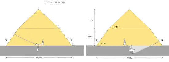 - Des mesures différentes ont été proposées pour les deux inclinaisons: 54° 27′ 44″ selon Jean-Philippe Lauer, 54° 34′ selon Ahmed Fakhry, puis 43° 22′