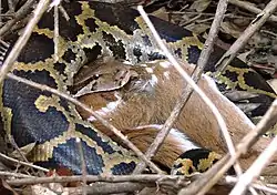 Python molure en train d'avaler un jeune Cerf axis dans le Parc national de Mudumalai en Inde