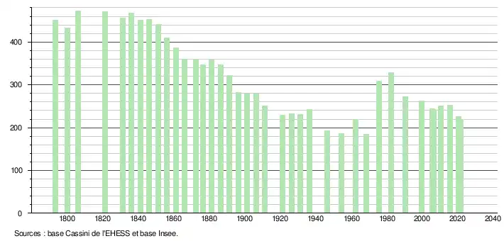 L'évolution du nombre d'habitants est connue à travers les recensements de la population effectués dans la commune depuis 1793. Pour les communes de moins de 10 000 habitants, une enquête de recensement portant sur toute la population est réalisée tous les cinq ans, les populations légales des années intermédiaires étant quant à elles estimées par interpolation ou extrapolation[37]. Pour la commune, le premier recensement exhaustif entrant dans le cadre du nouveau dispositif a été réalisé en 2005[38].
