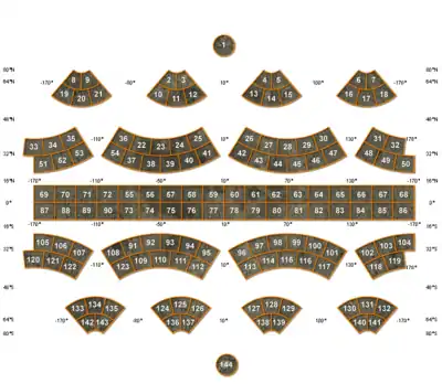 - (± 32° à ± 16°) 18 quadrangles de 20°, débutant à -90°