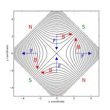 Un quadrupôle magnétique possède deux pôles nord et deux pôles sud, placés aux faces alternées d'un carré. Dans le centre du plan (noté ici z=0) où se trouvent les quatre pôles, le champ magnétique idéalisé est décrit très simplement :