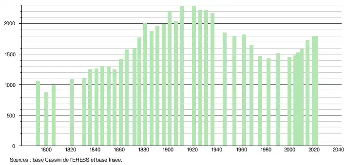 L'évolution du nombre d'habitants est connue à travers les recensements de la population effectués dans la commune depuis 1793. Pour les communes de moins de 10 000 habitants, une enquête de recensement portant sur toute la population est réalisée tous les cinq ans, les populations légales des années intermédiaires étant quant à elles estimées par interpolation ou extrapolation[27]. Pour la commune, le premier recensement exhaustif entrant dans le cadre du nouveau dispositif a été réalisé en 2004[28].