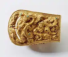 ![]() Boucle. Or et turquoise. Tombe n° 9, Sōgam-ni, Pyongyang. L. 9.5cm, H. 6.5cm. Art chinois, commanderie de Lelang. Musée national de Corée[6] |