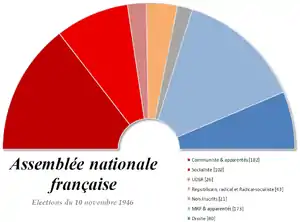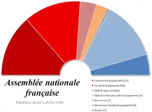 Les élections législatives, qui ont lieu le même jour, mettent en avant trois partis principaux : le Parti communiste français (PCF), qui a tiré un grand prestige de son rôle de force de résistance et de la victoire de l'URSS, le Mouvement républicain populaire (MRP) d'inspiration démocrate-chrétienne et la Section française de l'Internationale ouvrière (SFIO). Ces derniers forment par la suite une force gouvernementale unie, que l'on nommera le tripartisme.