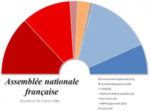 Le rejet du premier projet de Constitution entraîne l'élection d'une nouvelle Assemblée constituante le , dont les résultats confirment les tendances politiques précédentes. Les candidats du MRP, mouvement démocrate-chrétien qui s'est opposé au premier projet de constitution, totalisent 28,2 % des suffrages. Le PCF arrive en seconde position avec 26 % et la SFIO en troisième. Les résultats de la droite reculent encore par rapport à la première Assemblée constituante (13 % contre 16 % en malgré un gain en sièges). Un élu du MRP, Georges Bidault devient président du Conseil et constitue un cabinet qui obéit toujours au tripartisme.