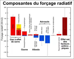 Le quatrième rapport d'évaluation décrit les effets de réchauffement et de refroidissement sur la planète en termes de forçage radiatif, c'est-à-dire le taux de changement d'énergie dans le système, mesuré en puissance par unité de surface[7]. Le rapport montre en détail les contributions individuelles au réchauffement (le forçage positif) du dioxyde de carbone, du méthane, du protoxyde d'azote (oxyde nitreux), des hydrocarbures halogénés, d'autres facteurs de réchauffement humains et les effets de réchauffement liés aux changements de l'activité solaire[7]. Les effets de refroidissement (le forçage négatif) des aérosols, des changements de la couverture du sol et d'autres activités humaines sont également indiqués[7]. Toutes les valeurs sont indiquées en rapport avec les conditions préindustrielles[7].
