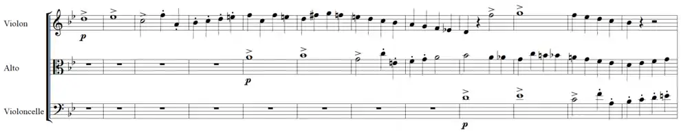 ), un adagio qui s'ouvre « dans une atmosphère sereine, mais le mouvement devient violent (più moto e con fuoco), avec des passages agités au violoncelle ; une atmosphère plus calme revient, à nouveau brisée par des passages agités dans la coda[8] » ; - Menuetto — Allegro en si bémol majeur, à