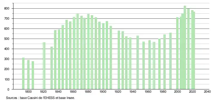 L'évolution du nombre d'habitants est connue à travers les recensements de la population effectués dans la commune depuis 1793. Pour les communes de moins de 10 000 habitants, une enquête de recensement portant sur toute la population est réalisée tous les cinq ans, les populations légales des années intermédiaires étant quant à elles estimées par interpolation ou extrapolation[24]. Pour la commune, le premier recensement exhaustif entrant dans le cadre du nouveau dispositif a été réalisé en 2004[25].