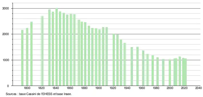 L'évolution du nombre d'habitants est connue à travers les recensements de la population effectués dans la commune depuis 1793. Pour les communes de moins de 10 000 habitants, une enquête de recensement portant sur toute la population est réalisée tous les cinq ans, les populations légales des années intermédiaires étant quant à elles estimées par interpolation ou extrapolation[23]. Pour la commune, le premier recensement exhaustif entrant dans le cadre du nouveau dispositif a été réalisé en 2008[24].