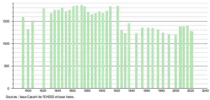 L'évolution du nombre d'habitants est connue à travers les recensements de la population effectués dans la commune depuis 1793. Pour les communes de moins de 10 000 habitants, une enquête de recensement portant sur toute la population est réalisée tous les cinq ans, les populations légales des années intermédiaires étant quant à elles estimées par interpolation ou extrapolation[30]. Pour la commune, le premier recensement exhaustif entrant dans le cadre du nouveau dispositif a été réalisé en 2005[31].