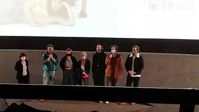 Première de Mandibules au Max Linder Panorama. De gauche à droite: Quentin Dupieux, Adèle Exarchopoulos, Coralie Russier, Roméo Elvis, David Marsais et Grégoire Ludig.