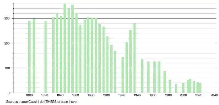 L'évolution du nombre d'habitants est connue à travers les recensements de la population effectués dans la commune depuis 1800. Pour les communes de moins de 10 000 habitants, une enquête de recensement portant sur toute la population est réalisée tous les cinq ans, les populations légales des années intermédiaires étant quant à elles estimées par interpolation ou extrapolation[7]. Pour la commune, le premier recensement exhaustif entrant dans le cadre du nouveau dispositif a été réalisé en 2008[8].