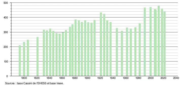 L'évolution du nombre d'habitants est connue à travers les recensements de la population effectués dans la commune depuis 1793. Pour les communes de moins de 10 000 habitants, une enquête de recensement portant sur toute la population est réalisée tous les cinq ans, les populations légales des années intermédiaires étant quant à elles estimées par interpolation ou extrapolation[30]. Pour la commune, le premier recensement exhaustif entrant dans le cadre du nouveau dispositif a été réalisé en 2007[31].