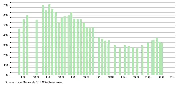 L'évolution du nombre d'habitants est connue à travers les recensements de la population effectués dans la commune depuis 1793. Pour les communes de moins de 10 000 habitants, une enquête de recensement portant sur toute la population est réalisée tous les cinq ans, les populations légales des années intermédiaires étant quant à elles estimées par interpolation ou extrapolation[22]. Pour la commune, le premier recensement exhaustif entrant dans le cadre du nouveau dispositif a été réalisé en 2008[23].