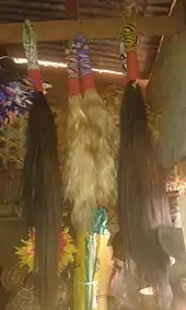 La queue de cheval ressemble à un chasse-mouche. Le manche est souvent constitué de bois sculpté ou décoré de perles.