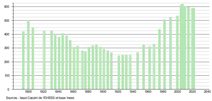 L'évolution du nombre d'habitants est connue à travers les recensements de la population effectués dans la commune depuis 1793. Pour les communes de moins de 10 000 habitants, une enquête de recensement portant sur toute la population est réalisée tous les cinq ans, les populations légales des années intermédiaires étant quant à elles estimées par interpolation ou extrapolation[16]. Pour la commune, le premier recensement exhaustif entrant dans le cadre du nouveau dispositif a été réalisé en 2004[17].