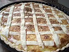 | Ingrédients | Pâte brisée ou pâte feuilletée, migaine d'œufs, de crème fraîche et de lardons. |