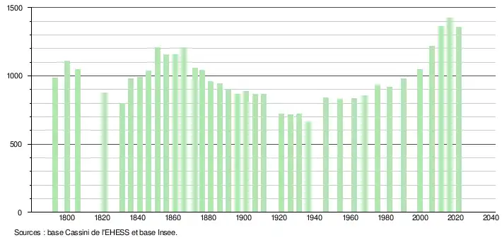 L'évolution du nombre d'habitants est connue à travers les recensements de la population effectués dans la commune depuis 1793. Pour les communes de moins de 10 000 habitants, une enquête de recensement portant sur toute la population est réalisée tous les cinq ans, les populations légales des années intermédiaires étant quant à elles estimées par interpolation ou extrapolation[16]. Pour la commune, le premier recensement exhaustif entrant dans le cadre du nouveau dispositif a été réalisé en 2006[17].