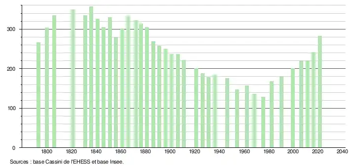 L'évolution du nombre d'habitants est connue à travers les recensements de la population effectués dans la commune depuis 1793. Pour les communes de moins de 10 000 habitants, une enquête de recensement portant sur toute la population est réalisée tous les cinq ans, les populations légales des années intermédiaires étant quant à elles estimées par interpolation ou extrapolation[18]. Pour la commune, le premier recensement exhaustif entrant dans le cadre du nouveau dispositif a été réalisé en 2006[19].