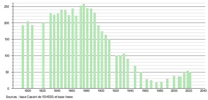 L'évolution du nombre d'habitants est connue à travers les recensements de la population effectués dans la commune depuis 1793. Pour les communes de moins de 10 000 habitants, une enquête de recensement portant sur toute la population est réalisée tous les cinq ans, les populations légales des années intermédiaires étant quant à elles estimées par interpolation ou extrapolation[33]. Pour la commune, le premier recensement exhaustif entrant dans le cadre du nouveau dispositif a été réalisé en 2008[34].