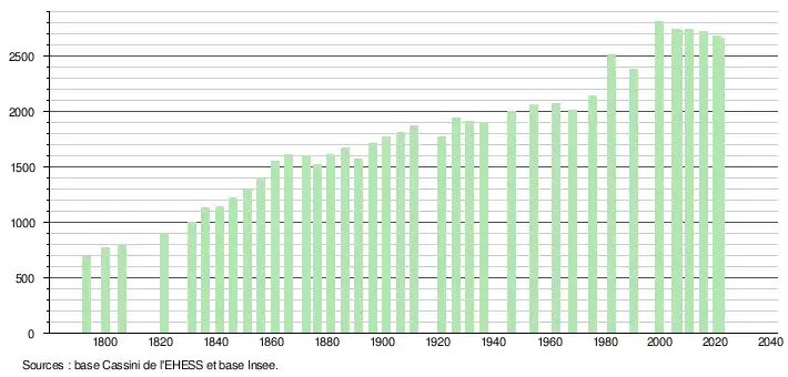 L'évolution du nombre d'habitants est connue à travers les recensements de la population effectués dans la commune depuis 1793. Pour les communes de moins de 10 000 habitants, une enquête de recensement portant sur toute la population est réalisée tous les cinq ans, les populations légales des années intermédiaires étant quant à elles estimées par interpolation ou extrapolation[32]. Pour la commune, le premier recensement exhaustif entrant dans le cadre du nouveau dispositif a été réalisé en 2005[33].