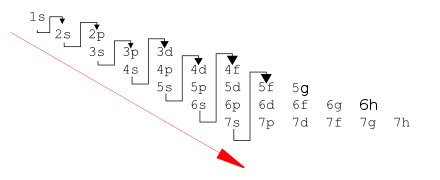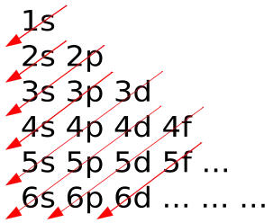 - 1s → 2s → 2p → 3s → 3p → 4s → 3d → 4p → 5s → 4d → 5p → 6s → 4f → 5d → 6p → 7s → 5f → 6d → 7p.