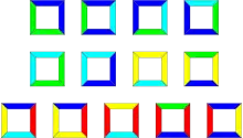 Exemple d'assemblage de quelques tuiles du jeu ci-dessus, respectant la contrainte que deux bords adjacents doivent être de la même couleur.