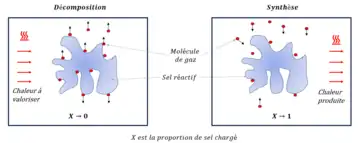 Comme le montre la figure ci-contre, le flux de gaz alimente le réacteur à l'état initial déchargé. Dans cette configuration, plusieurs étages de sel réactif poreux sont empilés, permettant au gaz de se synthétiser au contact du sel réactif.