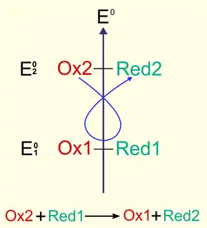 La réaction d'oxydoréduction est l'addition d'une oxydation et d'une réduction (de manière à simplifier les électrons). L'équation d'une oxydoréduction s'écrit de la manière suivante[9] :
