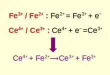 Par exemple, pour la réaction entre le permanganate de potassium (couple MnO4−/Mn2+) et une solution de fer (couple Fe3+/Fe2+), en milieu acide (présence d'ions H+) :